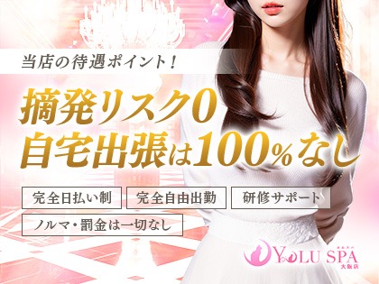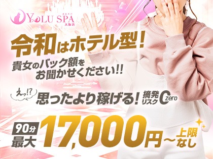 - 今大阪で注目ナンバーワンのグループ店! 「YOLU SPA(ヨルスパ)」 ♦♢女の子が安心して快適に稼げるを第1に♢♦ 安心安全の営業許可済みのお店です♪ 男性スタッフ10名以上が在籍しており、万が一の時も女の子を全力で守れるようサポートに努めております! 待機場はバレーボールのコートより広く、ストレスフリー♪ 綺麗な漫画喫茶のフラットブースの工事を入れており、完全な個室待機になりますので快適にお過ごしいただけます♪ 工事費用はなんと1000万円.....!!!! そう、全てはうちで働いていただけるセラピスト様の為なんです!! メンズエステにありがちな面倒なお掃除やタオル管理など雑務は一切なし♪ 肝心お給料は90分17000円以上! OP類や指名料はフルバックでお渡ししております♪ 関西でナンバーワンのお店を目指して、真面目にスタッフ一同頑張らせていただきます!! 一緒に働いて頂ける女性をご応募しております、どうかご質問だけでもご連絡いただけると嬉しいですm(__)m